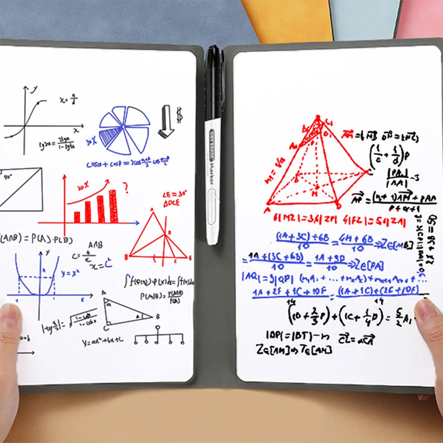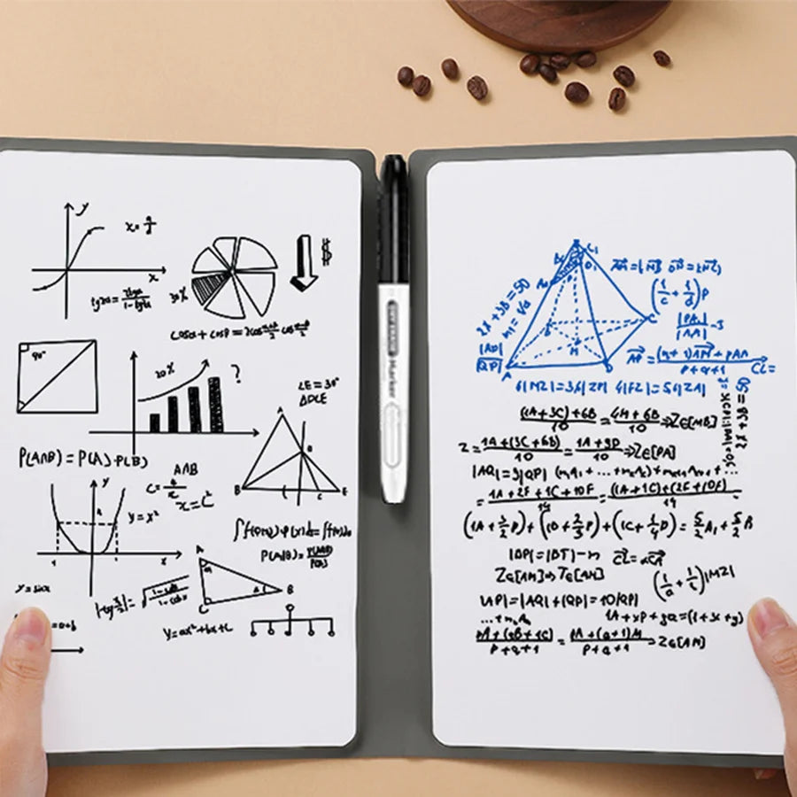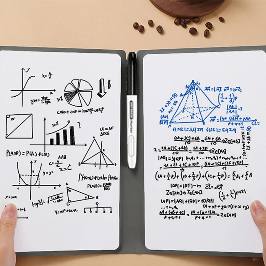 Deze herbruikbare whiteboard notebook in A5-formaat is jouw duurzame oplossing voor notities, planningen en creatieve ideeën. Met de bijgeleverde whiteboard pen en uitwisdoek schrijf je moeiteloos op en wis je weer schoon. Dankzij de ingebouwde wekelijkse planner houd je overzicht over al je afspraken, to-do’s en doelen. Compact, lichtgewicht en makkelijk mee te nemen – perfect voor school, werk of onderweg.